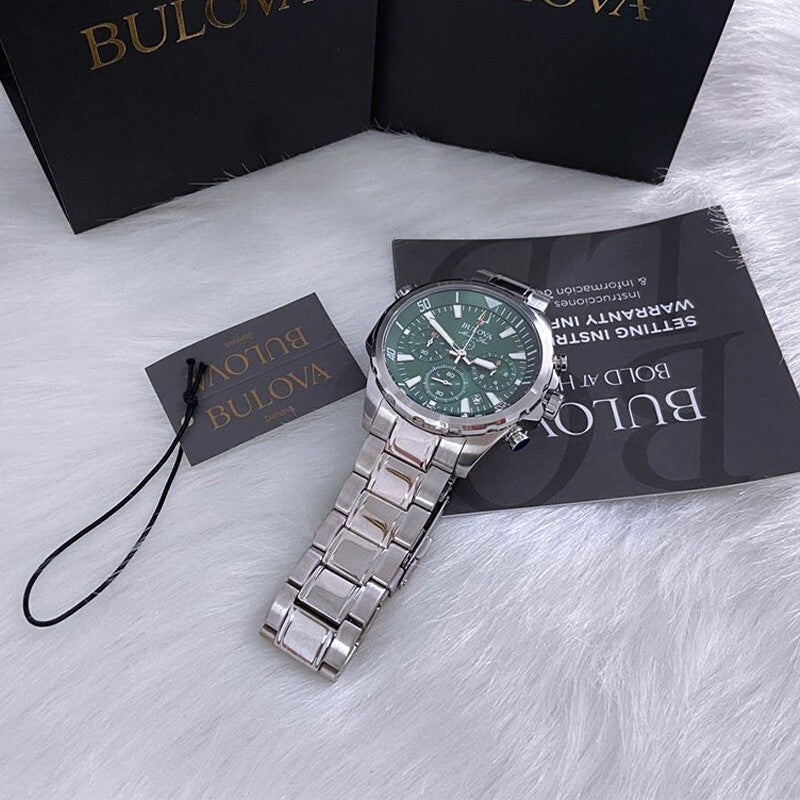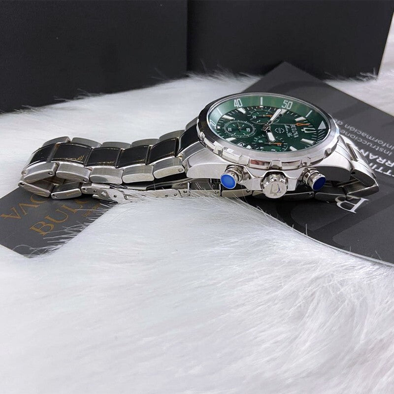O Bulova Marine Star 96B396 combina o espírito esportivo da coleção com um acabamento premium que conquista à primeira vista. Seu dial verde sunray cria profundidade e contraste para os marcadores aplicados e subdials do cronógrafo, enquanto a escala de tempo no aro reforça o caráter de mergulho urbano — perfeito para quem busca presença e versatilidade do trabalho ao lazer.