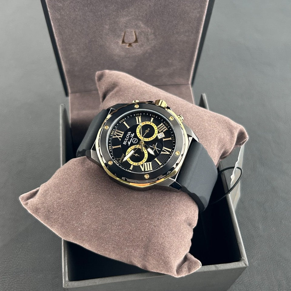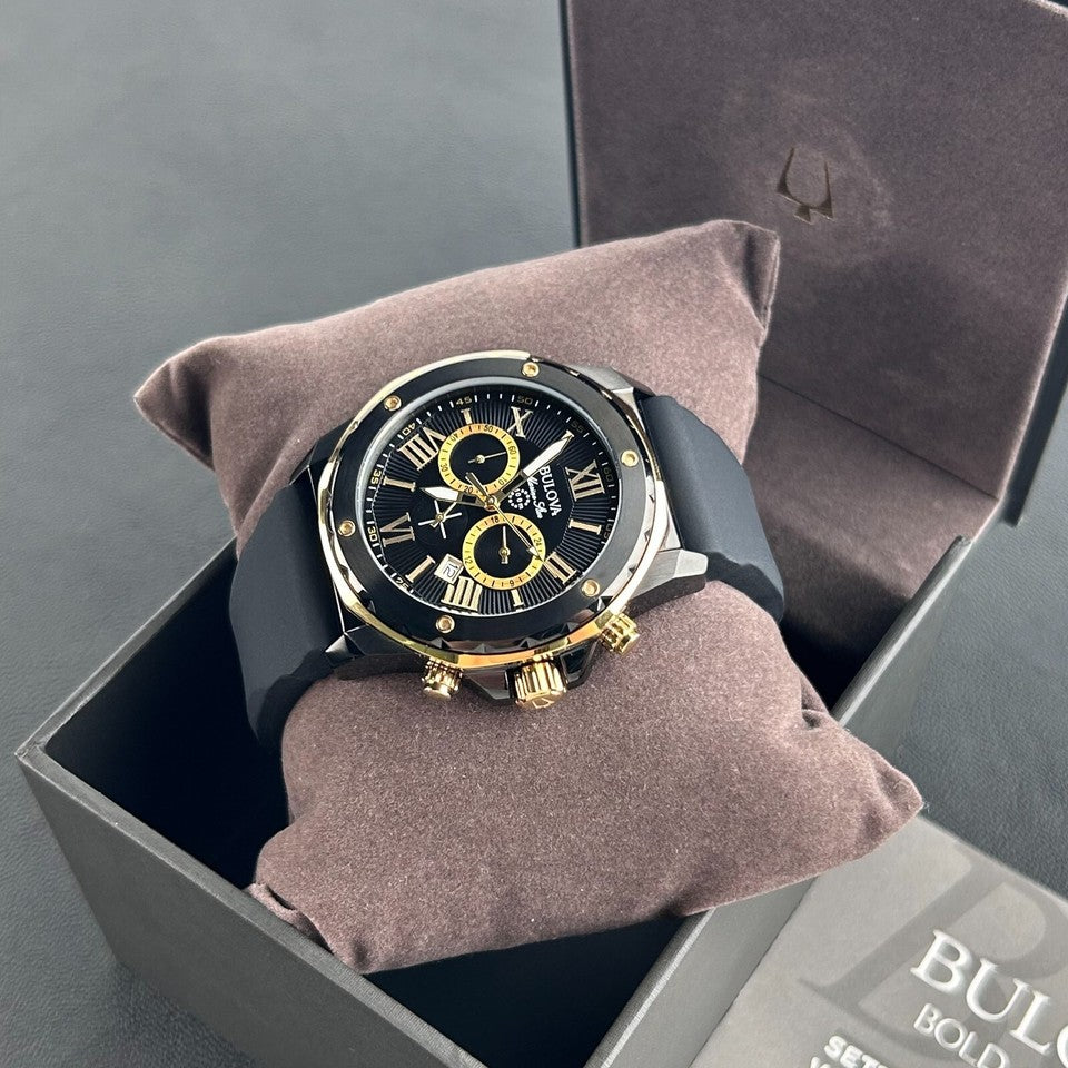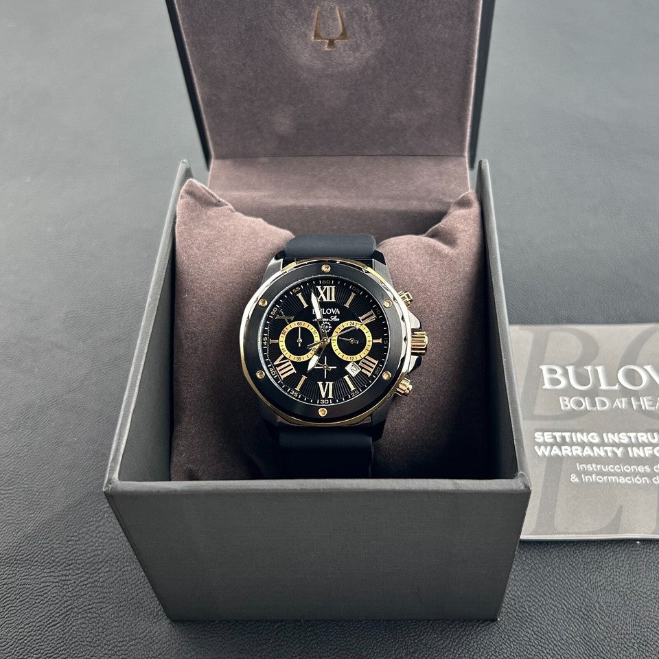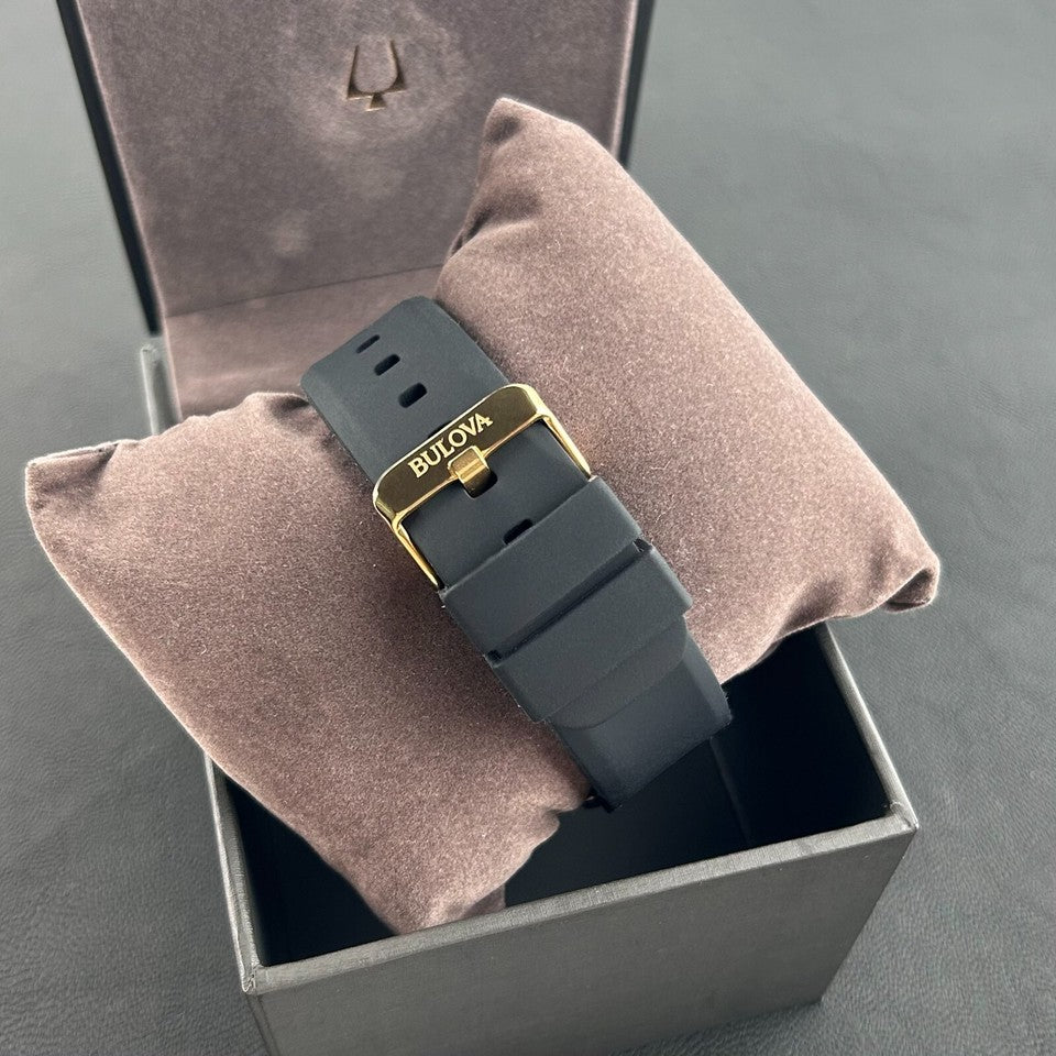 Os materiais premium destacam a qualidade Bulova: caixa em aço inoxidável two-tone (preto ionizado e gold-tone) para durabilidade e resistência à corrosão; pulseira em silicone preto de alta qualidade para conforto e longevidade; dial preto com acentos gold-tone e luminosos; vidro de cristal mineral resistente a impactos e arranhões; e fecho de fivela em gold-tone. Uma escolha versátil para entusiastas de relojoaria que valorizam funcionalidade aliada a estilo atemporal.