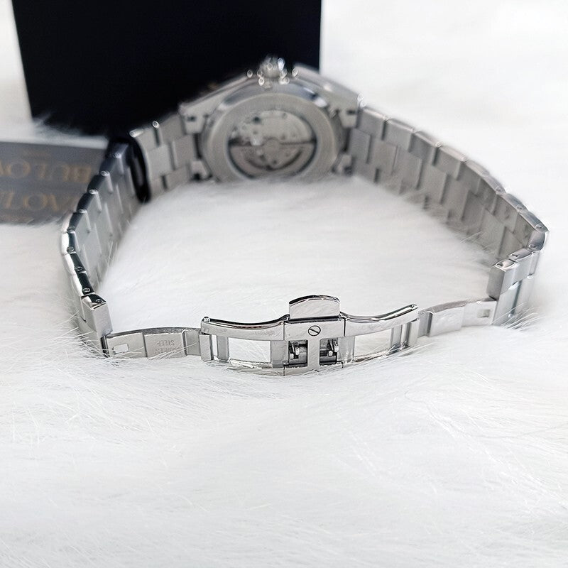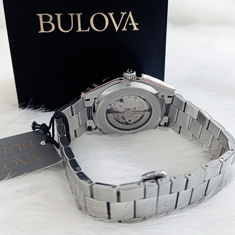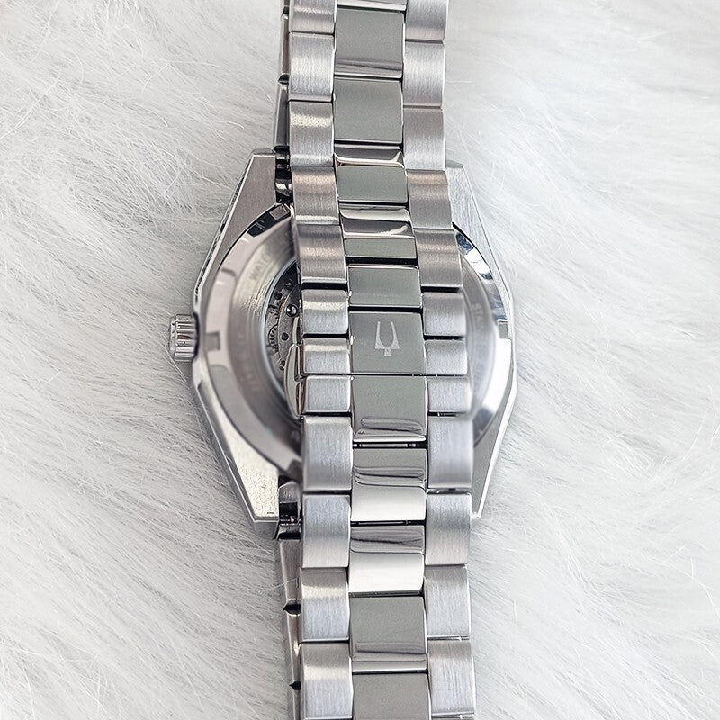 Movimento: Automático de 21 joias (família Miyota 82S0/8N24, usado pela Bulova em modelos Open Heart; hipótese baseada na arquitetura e na inscrição “21 JEWELS”).