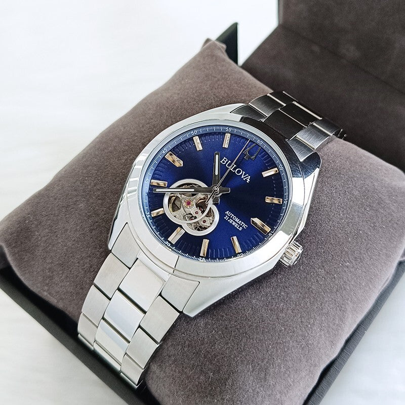 Sinta a elegância mecânica do Bulova Surveyor 96A275, um automático clássico com janela Open Heart que revela o pulso do movimento. O mostrador azul sunray cria um jogo de luz sofisticado, com índices aplicados e ponteiros facetados que garantem leitura imediata. É a escolha certeira para quem busca um relógio de presença marcante, mas versátil para o dia a dia ou ocasiões formais.