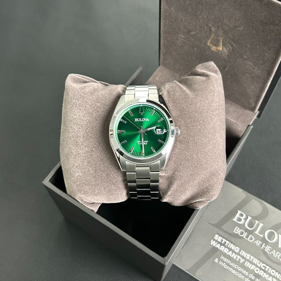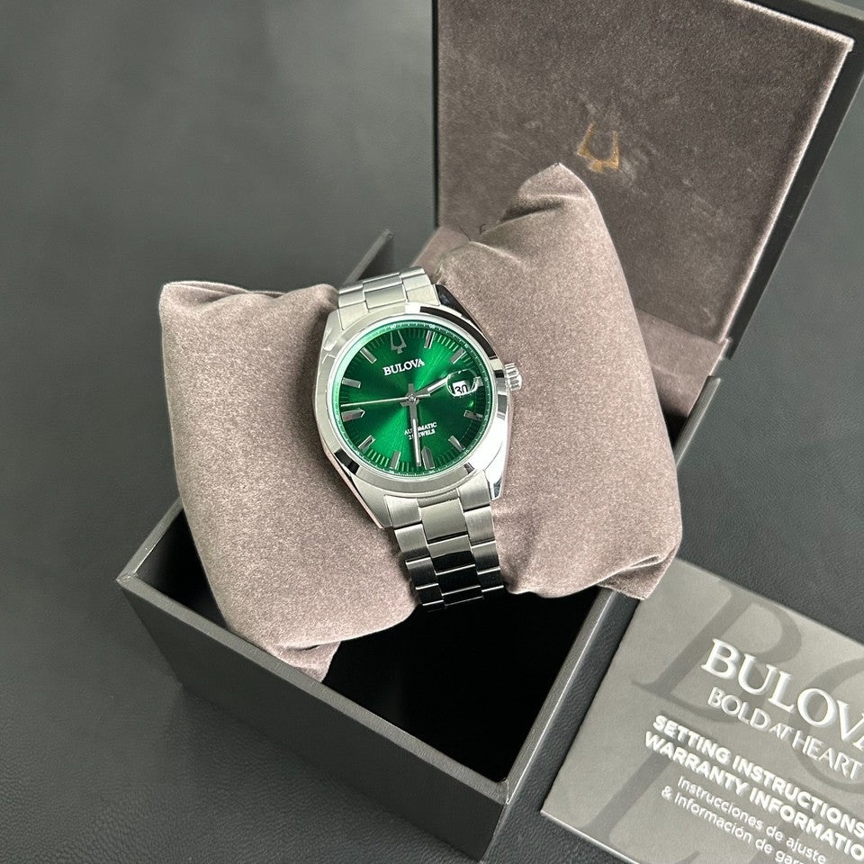 Sinta a presença marcante do Bulova Surveyor, modelo 96B429, uma criação da casa fundada em 1875 que combina linhas clássicas com um dial verde sunray de brilho hipnótico. Os índices aplicados e os ponteiros facetados realçam a leitura, enquanto a janela de data às 3 horas com lupa acrescenta praticidade e um toque de sofisticação ao uso cotidiano — perfeito para quem busca elegância versátil do escritório ao fim de semana.