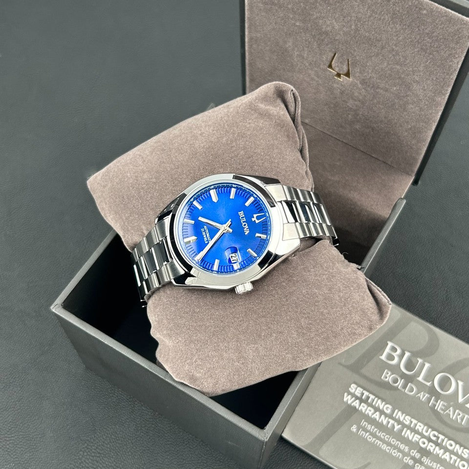 Materiais de excelência elevam a peça: caixa e pulseira em aço inoxidável com alternância de superfícies polidas/escovadas; dial azul com efeito sunray e índices aplicados; vidro mineral com lupa sobre a data; fecho deployant com trava e logotipo Bulova. (Observação: dentro da linha Surveyor, muitos modelos trazem fundo de caixa em vidro exibindo o movimento — característica provável deste exemplar.)