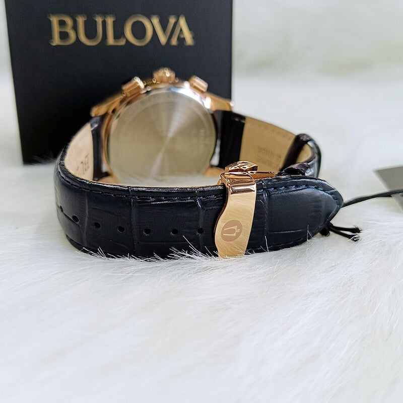 A caixa em aço inoxidável com banho rose gold (≈46,5 mm) oferece imponência e acabamento premium, enquanto a pulseira em couro preto com fecho deployant de duplo botão garante conforto e praticidade ao vestir. O cristal mineral protege o mostrador contra impactos do dia a dia e realça a profundidade do azul. No interior, o movimento quartz assegura alta precisão, acionando as funções de cronógrafo e calendário com confiabilidade e baixa manutenção.