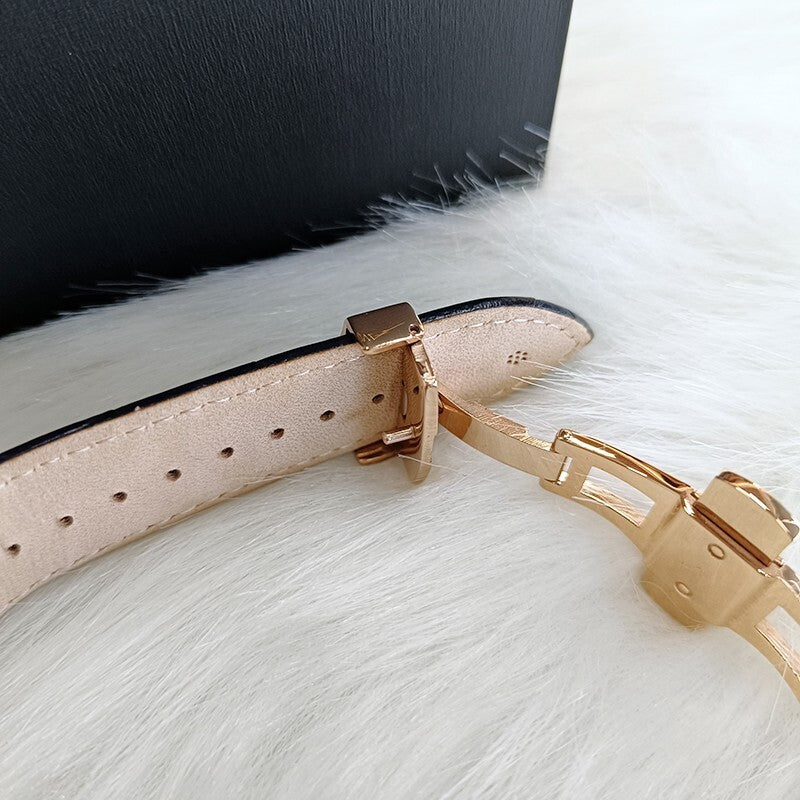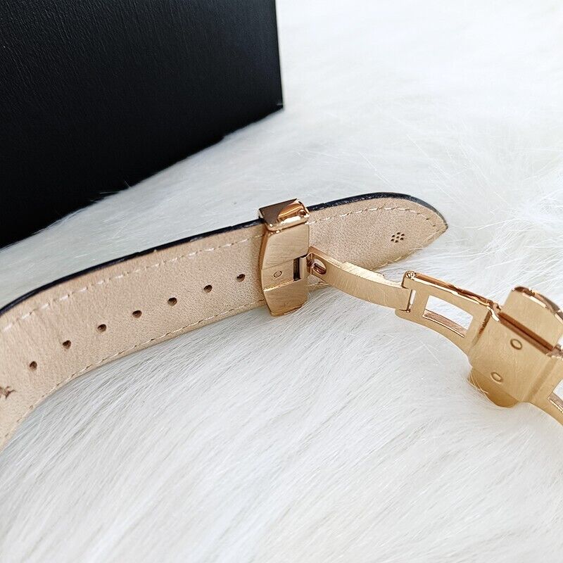 Materiais: Caixa em aço rose gold; pulseira em couro genuíno; fivela/fecho em aço; fundo em aço.